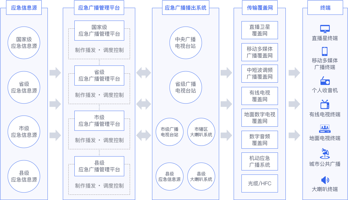 调度+播控双核打造,给予一站式解决服务,全面贯通国家、省、市、县四级应急广播平台,形成上下联动的应急广播体系