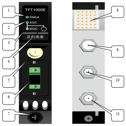 | 2 | AGC mode: green means enabled, white means disabled, default is AGC mode | 9 | RF port CRF input test port (optical) |